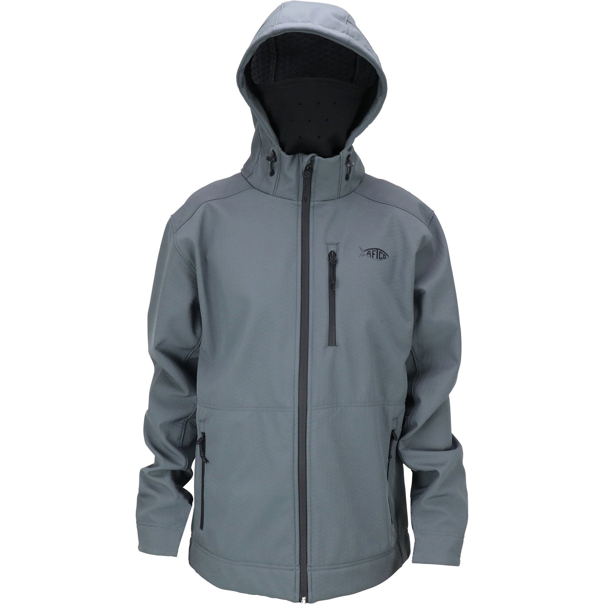 Reaper windproof zip up Jacket comes as a zip up for men with built-in facemask that is sewn in to the back where the jacket meets the hood. A comfortable solution when you are putting on the jacket and can place the facemask on or around your neck. This warm softshell Reaper zip up jacket will keep you toasty with Hexatron™ tricot backing and a 90% Polyester / 10% Spandex 3L rip stop stretch coated with DWR to bead water for rainy conditions. Easily take this jacket off when you're clear of rainy clouds and are ready to enjoy warm conditions and cast comfortably. Along with laser cut vented holes on the underarms and hood shock cord adjustments this jacket will easily be your go-to when your next fishing trip weather conditions has a 100% chance of rain. Â